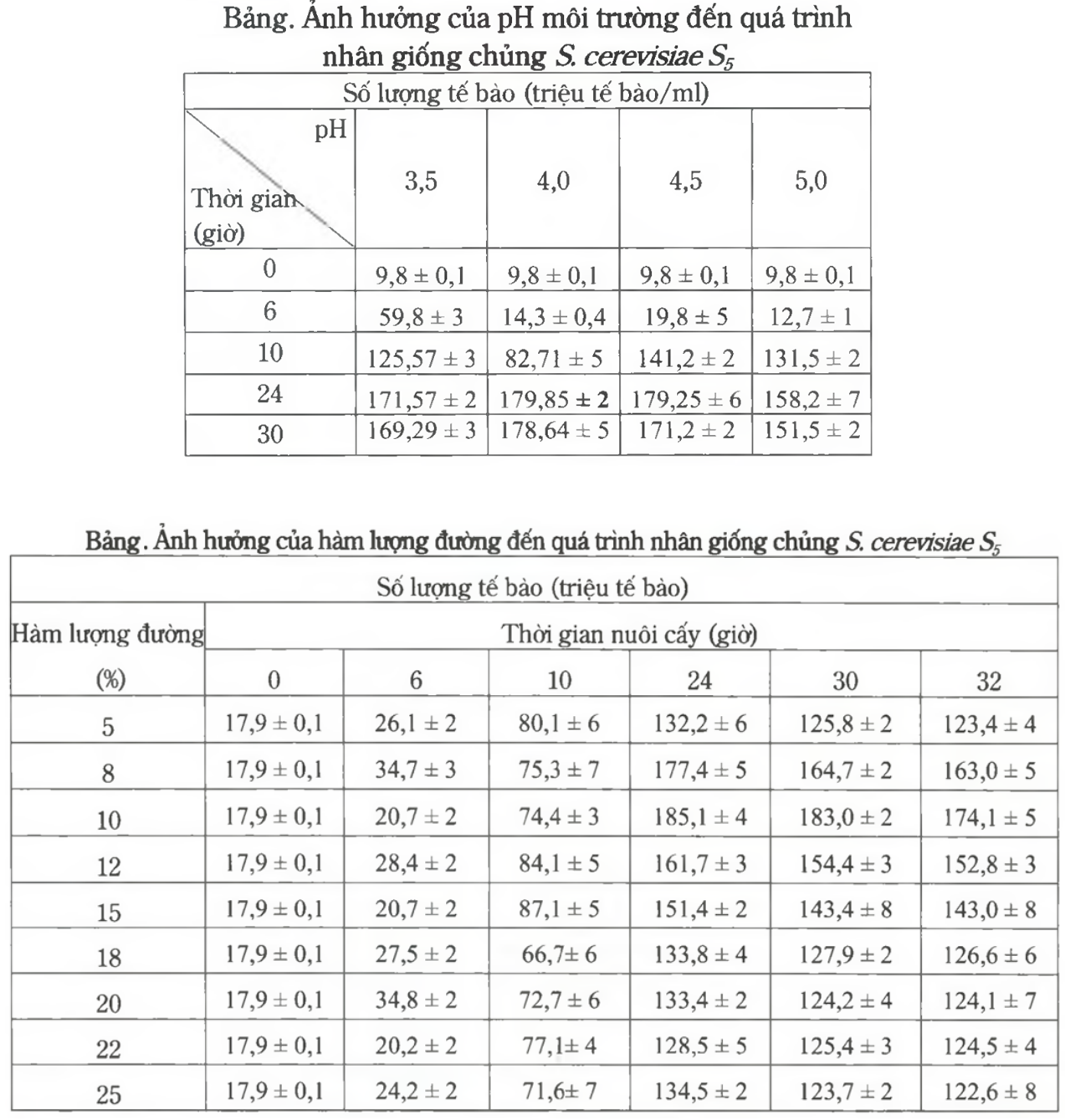 "Để thu được mật độ nấm men cao nhất trong thời gian ngắn nhất (24 giờ), thông số kỹ thuật cần thiết lập là pH đạt và hàm lượng đường ban đầu là . Khi đó, mật độ tế bào có thể đạt trên triệu tế bào/ml."