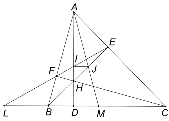 1) Cho tam giác $ABC$ nhọn có $AB < AC$ và các đường cao $AD,BE,CF$ cắt nhau tại $H$. Gọi $I$ là giao điểm của $EF$ và $AH$. Kẻ $IJ$ song song với $BC$ ($J$ thuộc $HE$). Đường thẳng $AJ$ cắt $BC$ tại $M$.