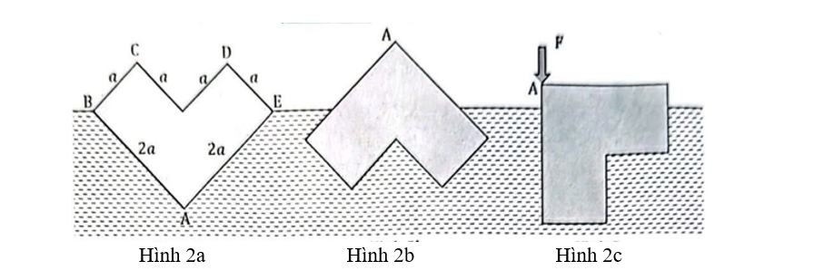 Một khúc gỗ hình lập phương có độ dài các cạnh là 2a bị cắt bỏ đi một phần tư và thả nổi trên mặt nước. Hình 2 thể hiện mặt cắt ngang của khúc gỗ cân bằng trên mặt nước với ba tư thế nằm khác nhau, trong đó cách cân bằng thứ ba cần phải được hỗ trợ bởi một lực F có phương thẳng đứng đặt tại đầu A (Hình 2c). Cho a = 6 cm và khối lượng riêng của khúc gỗ là D₀=1000 kg/m³.
