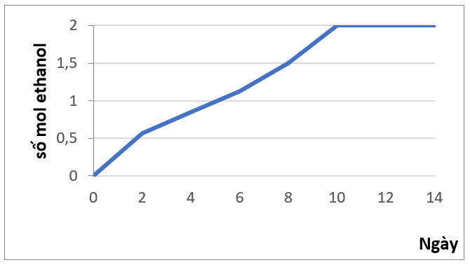 Trong quá trình lên men tinh bột thành ethanol, nấm men là xúc tác giúp chuyển hóa glucose thành ethanol và khí CO₂ trong điều kiện yếm khí (không có oxygen), quá trình lên men tỏa nhiệt. Một học sinh thực hiện nghiên cứu thí nghiệm lên men glucose (trong 14 ngày) từ 300 gam glucose, thực hiện quá trình lên men rượu trong phòng thí nghiệm, kết quả biểu diễn theo đồ thị sau: