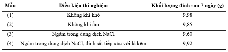 Bốn đinh sắt (được làm từ thép) giống nhau về hình dạng, kích thước (khối lượng ban đầu đều là 10,00g) được đặt trong các điều kiện khác nhau trong 7 ngày: