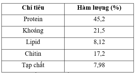 Xác tôm mịn thu được từ quá trình ép phế liệu tôm (chiếm khoảng 1% khối lượng phế liệu ban đầu) được sử dụng để sản xuất dịch đạm thủy phân tại công ty Cổ phần V. Do ở dạng bột khá mịn nên phần này thường được để lại ngay trong dịch thủy phân, làm giảm chất lượng dịch và lãng phí nguyên liệu sản xuất chitin/chitosan. Xác tôm mịn được phân tích các thành phần hóa học cơ bản và thể hiện ở bảng dưới đây: