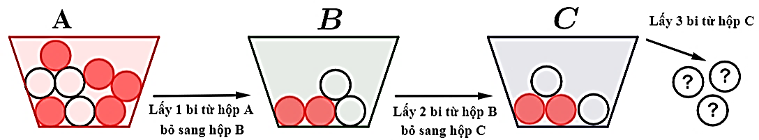 Hộp A có 5 bi đỏ và 3 bi trắng, hộp B có 2 bi đỏ và 2 bi trắng, hộp C có 2 bi đỏ và 2 bi trắng. Lấy ngẫu nhiên 1 bi từ hộp A bỏ sang hộp B, rồi lấy ngẫu nhiên 2 bi từ hộp B bỏ sang hộp C, sau cùng lấy ngẫu nhiên 3 bi từ hộp C ra bên ngoài. Những phương án nào dưới đây đúng?