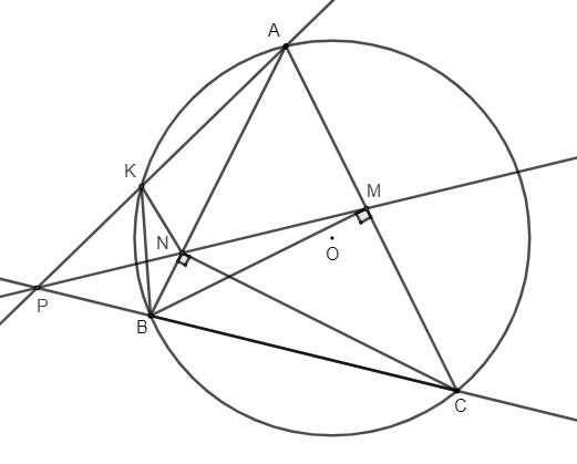 2) Cho tam giác ABC $(AB < AC)$ có ba góc nhọn nội tiếp đường tròn $(O)$. Các đường cao BM, CN của tam giác ABC cắt nhau tại điểm H. Gọi P là giao điểm của hai đường thẳng MN và BC. Đường thẳng AP cắt đường tròn $(O)$ tại điểm K (K khác A).