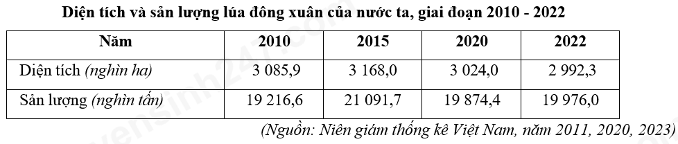 Theo bảng số liệu, nhận xét nào sau đây đúng về tình hình sản xuất lúa đông xuân của nước ta giai đoạn 2010 - 2022?