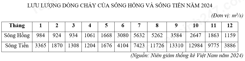 Dựa vào bảng số liệu, nhận xét nào sau đây đúng khi so sánh lưu lượng dòng chảy trên sông Tiền và sông Hồng?