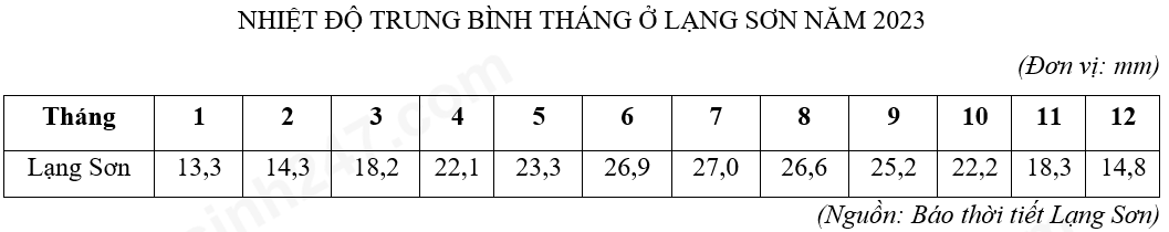 Cho bảng số liệu:Dựa vào bảng số liệu, hãy cho biết nhiệt độ trung bình năm tại Lạng Sơn
