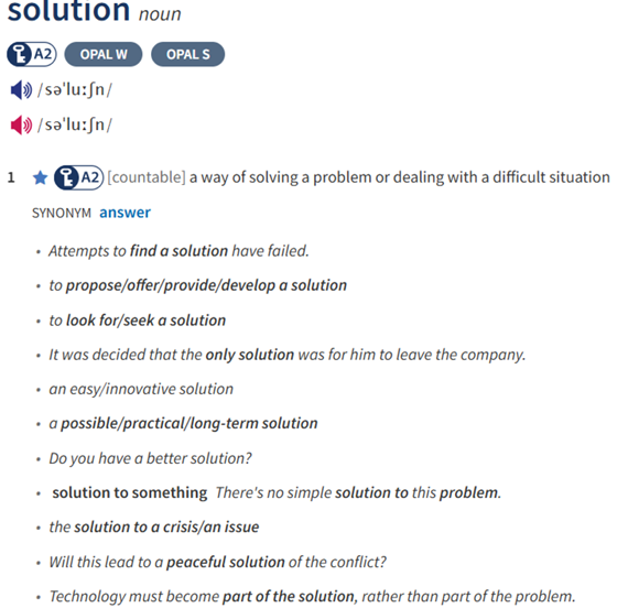 - a possible/practical/long-term solution: giải pháp có thể thực hiện / thực tế / mang tính dài hạn. - solution to something: giải pháp cho cái gì đó.
