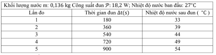 Một nhóm HS muốn đo nhiệt dung riêng của nước. Họ thực hiện các nội dung sau: (I) chuẩn bị các dụng cụ gồm: biến áp nguồn, nhiệt lượng kế cách nhiệt tốt kèm dây điện trở; nhiệt kế, oát kế, đồng hồ bấm giây; (II) họ cho rằng muốn đo nhiệt dung riêng c cần đo nhiệt lượng cung cấp cho nước Q, khối lượng nước m làm thí nghiệm, độ biến thiên nhiệt độ của nước $\Delta t$; (III) họ tiến hành đo khối lượng nước làm thí nghiệm, đo nhiệt độ ban đầu, công suất đun, thời gian đun, đọc số chỉ nhiệt kế sau mỗi 3 phút (thu được bảng số liệu như hình bên), vẽ đồ thị biểu diễn sự phụ thuộc của nhiệt độ vào thời gian; (IV) sau đó họ sử dụng công thức $c = \dfrac{Q}{m\Delta t}$ để xác định nhiệt dung riêng. Bỏ qua sai số dụng cụ.