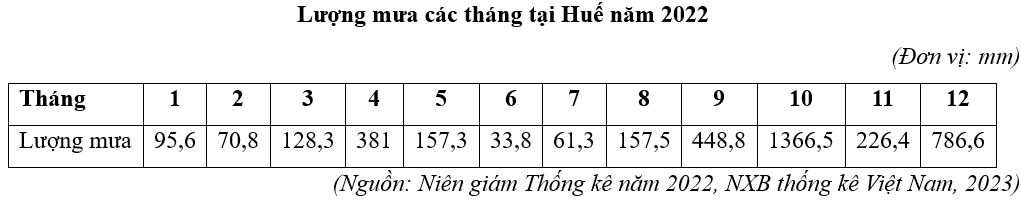 Cho bảng số liệu: Căn cứ vào bảng số liệu trên, tính tổng lượng mưa của Huế năm 2022 (làm