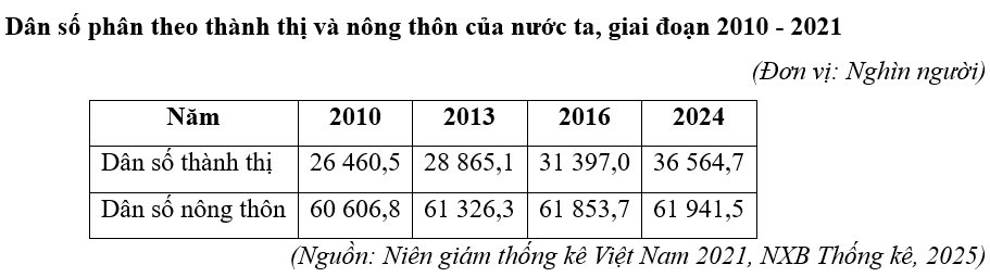 Cho bảng số liệu: Hãy cho biết tốc độ tăng trưởng dân số thành thị của nước ta năm 2024