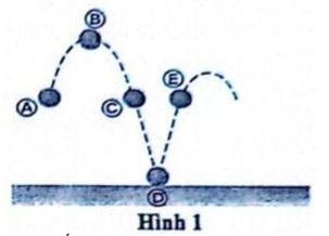 Một quả bóng bàn được tung từ vị trí A lần lượt qua các vị trí B và C, va chạm với mặt bàn nằm ngang tại D rồi nảy lên tiếp tục qua vị trí E... Hình 1 mô tả một phần quỹ đạo chuyển động của quả bóng bàn. Biết A, C và E có cùng độ cao so với mặt bàn. Chọn mốc thế năng tại D. Phát biểu nào sau đây đúng?