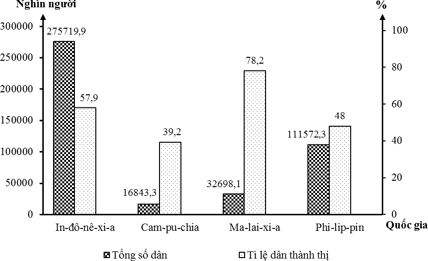 Cho biểu đồ về tổng số dân và tỉ lệ dân thành thị của một số quốc gia Đông Nam Á năm 2022: