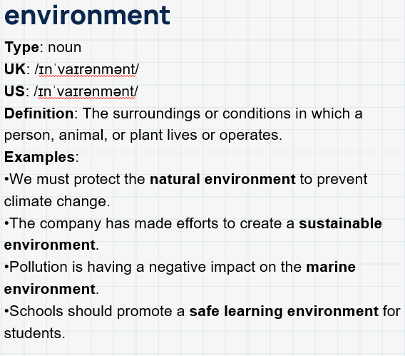 VI. Look at the entry of the word environment in a dictionary. Use what you can get from the entry to complete the sentences with two or three words. (0.5pt)