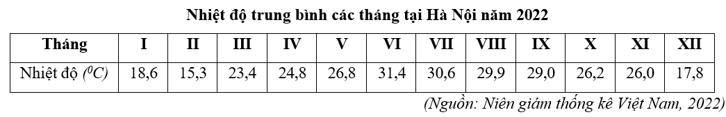 Cho bảng số liệu: Cho biết biên độ nhiệt năm của Hà Nội năm 2022 là bao nhiêu 0C? (làm tròn