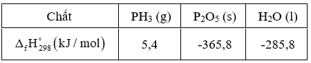 Phosphine (PH3) là một chất khí không màu, nhẹ hơn không khí, rất độc và dễ cháy. Phản ứng cháy phosphine như sau: $\left. 2\text{PH}_{3{(\text{~g})}} + 4\text{O}_{2{(\text{~g})}}\rightarrow\text{P}_{2}\text{O}_{5{(\text{~s})}} + 3\text{H}_{2}\text{O}_{(\text{l})} \right.$. Nhiệt tạo thành chuẩn của các chất cho trong bảng bên dưới.