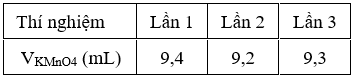 - Bước 2: Lấy 10,00 mL dung dịch Y cho vào bình tam giác, thêm 5 mL sulfuric acid nồng độ 1 M. Tiến hành chuẩn độ bằng dung dịch KMnO4 0,015M đến khi dung dịch chuyển từ không màu sang màu tím nhạt bền trong 20 giây (đây là điểm tương đương của phép chuẩn độ). Lặp lại thí nghiệm chuẩn độ thêm 2 lần nữa. Kết quả thể tích dung dịch KMnO4 0,015M được ghi trong bảng sau: