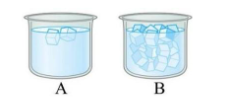 Hai cốc $A$ và cốc $B$ trong hình bên đang ở trạng thái cân bằng nhiệt, đều chứa nước và nước đá. So với nhiệt độ của nước trong cốc B thì nhiệt độ của nước trong cốc A