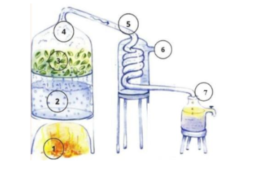 Một nhóm học sinh thực hiện dự án chưng cất tinh dầu bạc hà bằng phương pháp "lôi cuốn hơi nước" với hệ thống như hình bên. Qui trình thực hiện như sau: Nước trong bình (2) nhận nhiệt từ nguồn nhiệt (1), hóa hơi và đi qua nguyên liệu (3), cuốn theo tinh dầu bạc hà; Hỗn hợp hơi nước - tinh dầu (4) đi qua ống dẫn (5) vào bình ngưng (6) được làm nguội và ngưng tụ thành hỗn hợp lỏng và thu vào bình chứa (7); Sau đó dùng kĩ thuật tách để lấy tinh dầu khỏi nước. Nhóm sử dụng bình ngưng chứa $5,0\text{lít}$ nước ban đầu ở $15,0^{0}\text{C}$ và không thay nước trong cả quá trình. Sau 4 giờ thì hoàn thành quá trình chưng cất, khi đó nước trong bình ngưng có nhiệt độ $40,0^{0}\text{C}$. Bỏ qua quá trình truyền nhiệt của hệ thống ra môi trường, khối lượng riêng và nhiệt dung riêng của nước là $D_{n} = 0,997\text{g/cm}^{3}$; $c_{n} = 4,180\dfrac{\text{J}}{\text{g}\text{.K}}$.
