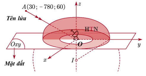 Hình chỏm cầu có một đáy là một phần của hình cầu bị chia bởi một mặt phẳng. Một rada có thể phát hiện các mục tiêu trong khu vực của một hình chỏm cầu với chiều rộng trên mặt đất là một hình tròn với bán kính 450 km và chiều cao 30 km. Chọn hệ trục tọa độ Oxyz với mặt phẳng Oxy là mặt đất (xem mặt đất là mặt phẳng), trục Oz hướng lên cao và gốc tọa độ O trùng với vị trí của rada (tham khảo hình vẽ bên), mỗi đơn vị trên trục là 1 km. Một tên lửa bắt đầu từ vị trí điểm A(30; –780; 60), dự định bay thẳng với vận tốc không đổi 7 km/giây hướng thẳng đến vị trí của rada. Thời gian dự kiến từ khi tên lửa bị rada phát hiện đến khi nó bắn trúng rada là bao nhiêu giây? (làm tròn đến hàng đơn vị).