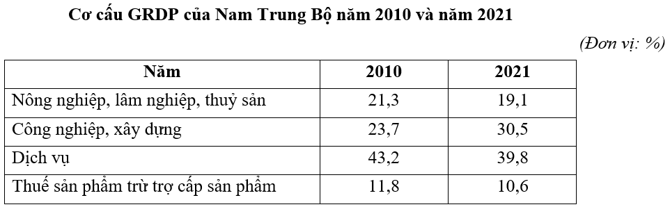 Nhận xét nào sau đây đúng với sự chuyển dịch cơ cấu GRDP của Nam Trung Bộ trong giai đoạn 2010 - 2021?