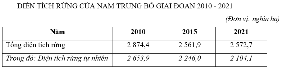 Cho bảng số liệu sau:Vẽ biểu đồ thể hiện diện tích rừng của Nam Trung Bộ, trong đó có