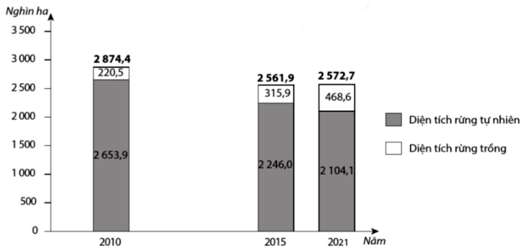 Vẽ biểu đồ thể hiện diện tích rừng của Nam Trung Bộ, trong đó có diện tích rừng tự nhiên và diện tích rừng trồng giai đoạn 2020 - 2021.