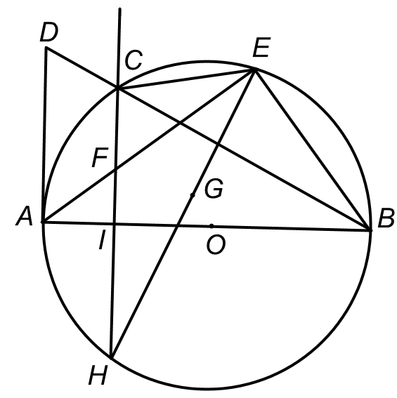 2) Cho đường tròn tâm $O$ đường kính $AB = 2\text{R}$, trên đoạn $OA$ lấy điểm $I\left( {I \neq A;I \neq O} \right)$. Kẻ tia $Ix$ vuông góc với $AB$ cắt ( $O$ ) tại $C$. Lấy điểm $E$ trên cung nhỏ $BC\left( {E \neq B;E \neq C} \right)$, $AE$ cắt $CI$ tại $F$. Gọi $D$ là giao điểm của đường thẳng $BC$ với tiếp tuyến tại $A$ của $\left( {O;R} \right)$.