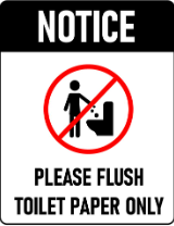 Biển báo: “NOTICE. Please flush toilet paper only.”