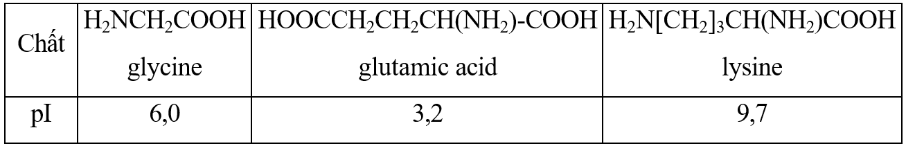 Giá trị pH mà khi đó amino acid có nồng độ ion lưỡng cực là cực đại được gọi là điểm đẳng điện (kí hiệu là pI). Khi pH < pI thì amino acid đó tồn tại ở dạng cation, còn khi pH > pI thì amino acid đó tồn tại ở dạng anion. Khi đặt trong một điện trường dạng anion sẽ di chuyển về cực (+) còn dạng cation sẽ di chuyển về cực (–). Tính chất này được gọi là tính điện di và được dùng để tách, tinh chế amino acid ra khỏi hỗn hợp của chúng. Cho các giá trị pI của các chất sau: