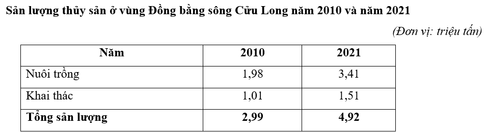 | b) Biểu đồ thích hợp nhất thể hiện cơ cấu sản lượng thủy sản ở vùng Đồng bằng sông Cửu Long năm 2010 và năm 2021 là biểu đồ tròn. | ||