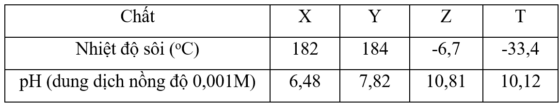 Cho X, Y, Z, T là các chất khác nhau trong số 4 chất: CH3NH2, NH3, C6H5OH (phenol), C6H5NH2 (aniline) và các tính chất được ghi trong bảng sau: