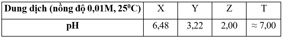Cho các dung dịch X, Y, Z, T là các dung dịch trong số bốn dung dịch sau: HCOOH; C2H5OH; HCl; C6H5OH. Giá trị pH của các dung dịch được ghi ở bảng dưới đây: