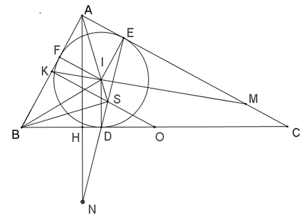 Cho tam giác $ABC$ vuông ở $A(AB < AC)$. Đường tròn tâm I nội tiếp tam giác $ABC$, tiếp xúc với các cạnh $BC,CA,AB$ lần lượt tại $D,E,F$. Gọi $S$ là giao điểm của $AI$ và $DE$.