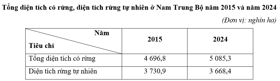 Căn cứ vào bảng số liệu trên, hãy cho biết diện tích rừng trồng của Nam Trung Bộ năm 2024 so với năm 2015 tăng bao nhiêu nghìn ha (làm tròn kết quả đến hàng đơn vị).