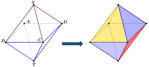 Đếm số cách gán số ($T_1$): Dựa trên ràng buộc "chung đúng một đỉnh thì khác số". Trong mỗi nhóm 4 mặt, hai mặt bất kỳ luôn chung ít nhất một đỉnh, nên mỗi nhóm phải dùng đủ bộ 4 số $\{1, 2, 3, 4\}$.
