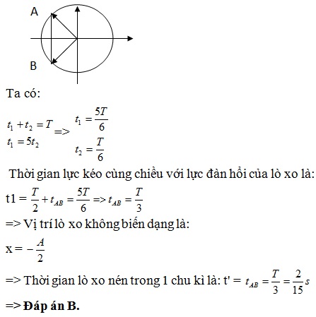 Một con lắc lò xo gồm vật nặng có khối lượng m và lò xo có độ cứng k dao động điều hòa theo phương thẳng đứng với tần số góc bằng 5π (rad/s) ở nơi có gia tốc trọng trường g = 10 m/s2, lấy π2 = 10. Biết gia tốc cực đại của vật nặng amax > g. Trong thời gian một chu kì dao động, thời gian lực đàn hồi của lò xo và lực kéo về tác dụng vào vật cùng hướng là t1, thời gian 2 lực đó ngược hướng là t2. Biết t1 = 5t2. Trong một chu kì thời gian lò xo bị nén là