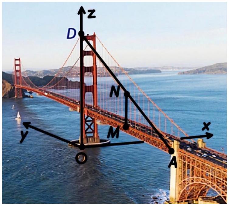Hình dưới đây là hình ảnh Cầu Cổng Vàng (The Golden Gate Bridge) ở Mỹ. Xét hệ trục tọa độ $Oxyz$ (như hình vẽ) với $O$ là điểm nằm trên bệ của chân cột trụ tại mặt nước, trục $Oz$ trùng với cột trụ, mặt phẳng $\left( {Oxy} \right)$ là mặt nước và trục $Oy$ cùng phương với cầu (đơn vị trên hệ trục tọa độ là mét). Dây cáp $AD$ (xem như một đoạn thẳng) nối điểm $D$ thuộc trục $Oz$ với một điểm $A$ thuộc mặt phẳng $\left( {Oyz} \right)$. Biết điểm $D$ là đỉnh cột trụ, cách mặt nước 227 m ; điểm $A$ cách mặt nước 75 m và cách trục $Oz$ một khoảng bằng 343 m.
