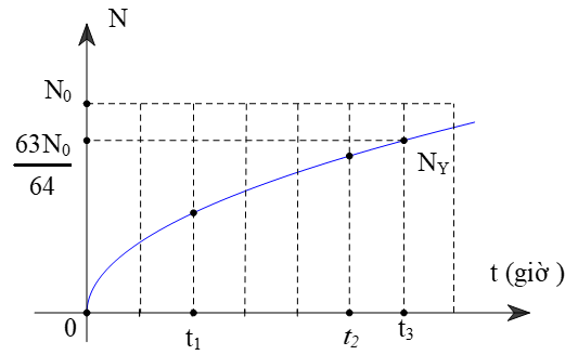 Hạt nhân ${}_{Z_{1}}^{A_{1}}X$ phóng xạ và biến thành một hạt nhân ${}_{Z_{2}}^{A_{2}}X$ bền. Coi khối lượng của hạt nhân X, Y bằng số khối của chúng tính theo đơn vị u. Biết chất phóng xạ X có chu kì bán rã là T. Ban đầu có $N_{0}$ hạt nhân chất X, đồ thị số hạt nhân Y tạo thành phụ thuộc theo thời gian như hình vẽ. Biết mỗi ô thẳng đứng là 2 giờ. Chu kì bán rã bằng bao nhiêu giờ?