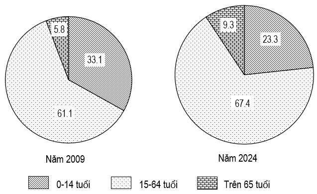Cơ cấu dân số theo tuổi nước ta năm 2009 và năm 2024 (Đơn vị: %)