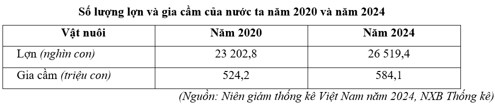 Căn cứ vào bảng số liệu trên, hãy cho biết chênh lệch tốc độ tăng trưởng năm 2024 so với năm 2020 giữa số lượng lợn và gia cầm ở nước ta là bao nhiêu % (làm tròn kết quả đến một chữ số thập phân).