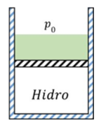 Một cylinder thẳng đứng một đầu kín và một đầu hở, bên trong có chứa một lượng khí Hidro. Cylinder được đậy kín nhờ một piston, phía trên piston có một cột chất lỏng như hình vẽ. Hidro được cấp nhiệt chậm, giãn nở đẩy piston di chuyển từ từ. Khi toàn bộ chất lỏng bị tràn ra ngoài thì nhiệt lượng mà Hidro đã nhận được là Q = 119J. Biết rằng thể tích ban đầu của chất lỏng bằng một nửa thể tích của khí Hidro và bằng thể tích của không khí chiếm trong cylinder. Áp suất phụ gây bởi cột chất lỏng này là $\dfrac{p_{0}}{9}$, với $p_{0} = 10^{5}\,\text{N/m}^{2}$là áp suất khí quyển. Bỏ qua mọi ma sát. Biết nội năng của $n$mol khí Hiđro ở nhiệt độ $T$là: $U = \dfrac{5}{2}nRT$, với $R$là hằng số chất khí.