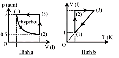 Một lượng khí lí tưởng có quá trình biến đổi trạng thái được mô tả trên hệ tọa độ $(p,V)$như hình a. Biết ở trạng thái (1) khối khí có nhiệt độ 270C.