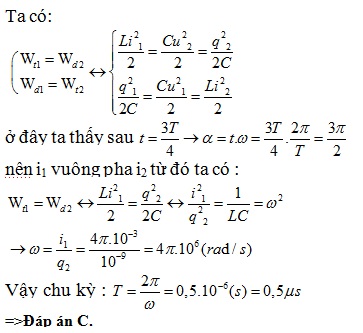 Mạch dao động L-C đang có dao động tự do với chu kỳ T. Tại thời điểm nào đó cuwòng độ dòng điện trong mạch có cường độ