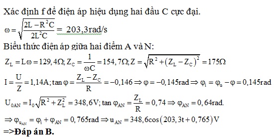 , C = 31,8μF, tần số f của dòng điện thay đổi được. Thay đổi giá trị của f để điện áp hai đầu tụ điện cực đại. Biểu thức điện áp giữa hai điểm A và N là: