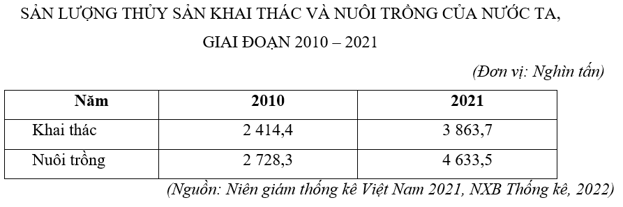 Theo bảng số liệu, hãy cho biết tốc độ tăng trưởng sản lượng thủy sản của nước ta năm 2021 so với năm 2010 là bao nhiêu phần trăm (năm 2010 = 100%) (Làm tròn kết quả đến hàng đơn vị)