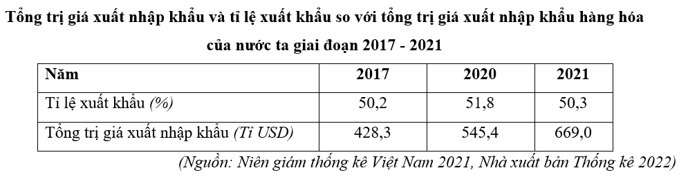 Cho bảng số liệu:Căn cứ bảng số liệu trên, cho biết năm bao nhiêu nước ta có giá trị xuất