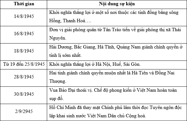 | c) Khởi nghĩa ở Hà Nội, Huế, Sài Gòn đã tác động lớn đến các địa phương khác trên cả nước giành chính quyền. | ||