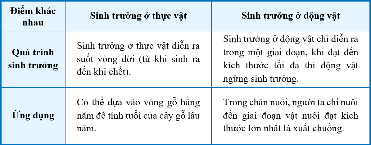 Nêu điểm khác nhau giữa sinh trưởng ở thực vật và động vật. Nêu ví dụ về ứng dụng sinh trưởng trên cơ sở hiểu biết sự khác nhau đó.