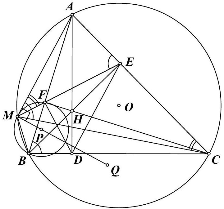 3. Gọi $M$ là giao điểm của tia $EF$ với đường tròn $(O)$. Gọi $P,Q$ lần lượt là tâm đường tròn ngoại tiếp tam giác $BMF$ và tam giác $CME$. Chứng minh $AM\bot PQ$.